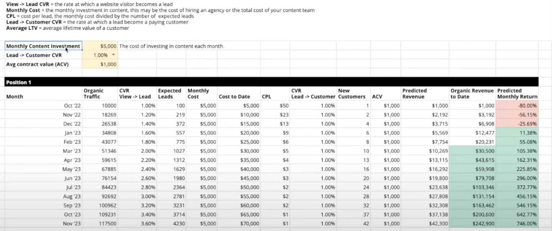 ROI model showing monthly revenue growth for SEO content marketing strategy.