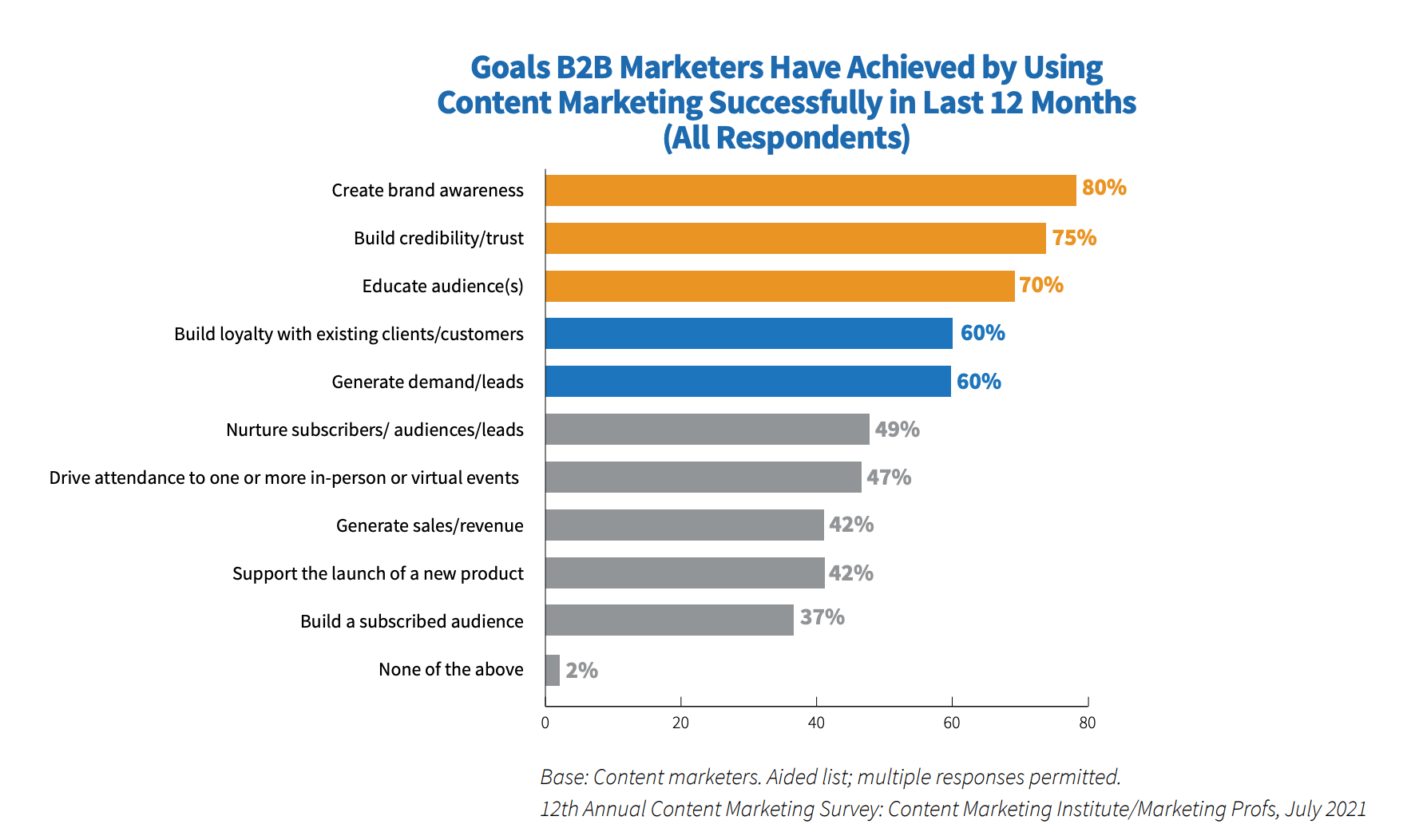 Revenue isn’t the only benefit of a successful content marketing strategy. In fact, CMI’s research found that 80% of respondents listed brand awareness as one of the top marketing goals achieved when investing in high-quality content.