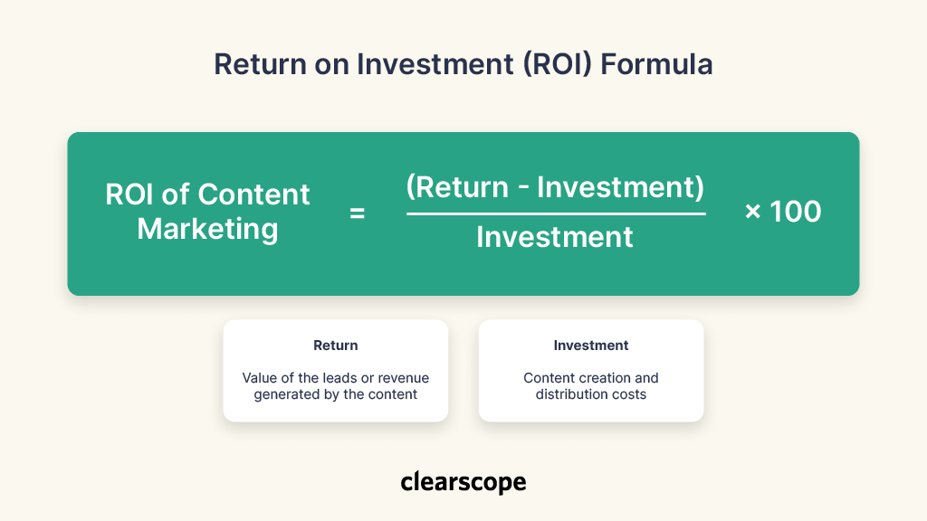 To measure ROI, divide your net return (total return minus costs) by your total costs (content creation and distribution) and multiply by 100 to get a percentage. For example, if you spent $1,000 on content and it brings you leads worth $4,000, then your net return is $3,000, and your ROI is 300%.