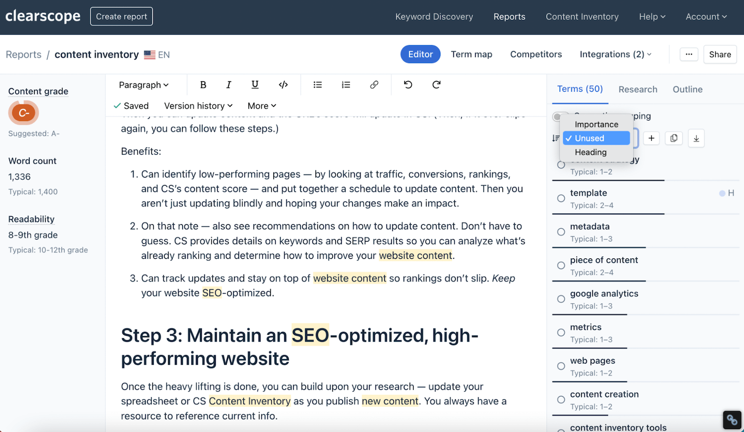 Note: Our content optimization software has features to audit, re-optimize, and monitor site content so you can achieve first page rankings (and stay there). Try our platform or schedule a demo with our team to see how Clearscope supports your workflows.