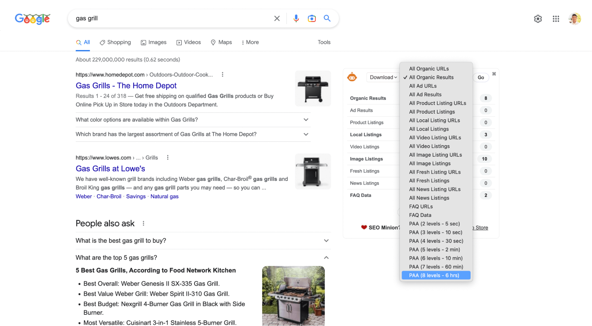 Load up SEO Minion and search your keyword. We’ll continue with the “gas grill” example here. You’ll set the drop-down menu to “8 levels”. This clicks and expands the questions 8 times. This will get a lot of questions or topics.