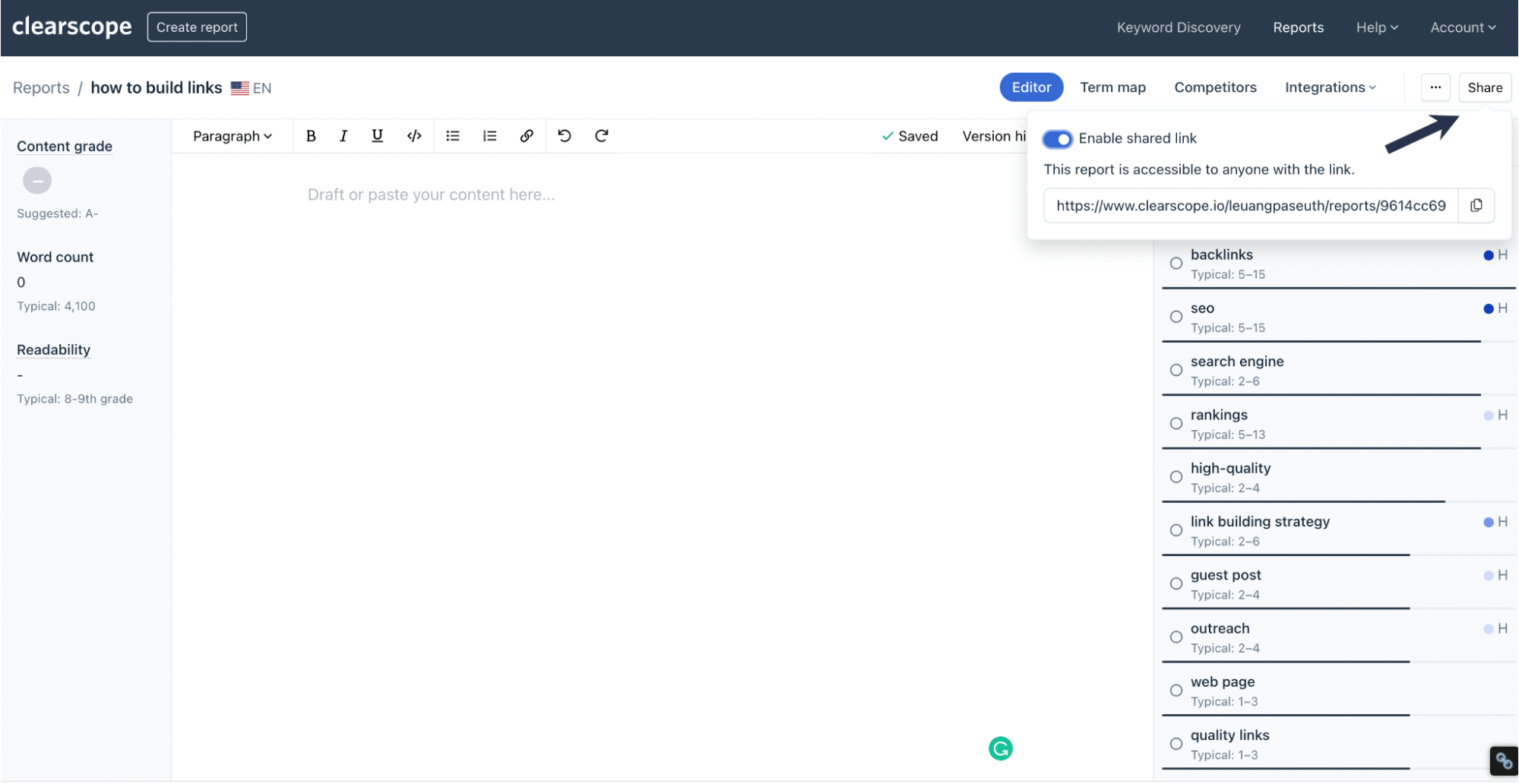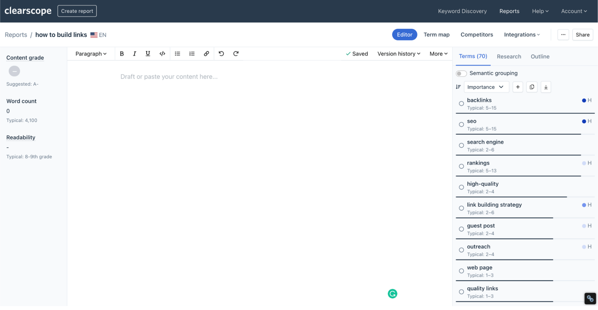 Once you plug a keyword into Clearscope, you’ll receive a unique draft/document. The draft will tell you the recommended readability level of the content, word count, and content grade or score.