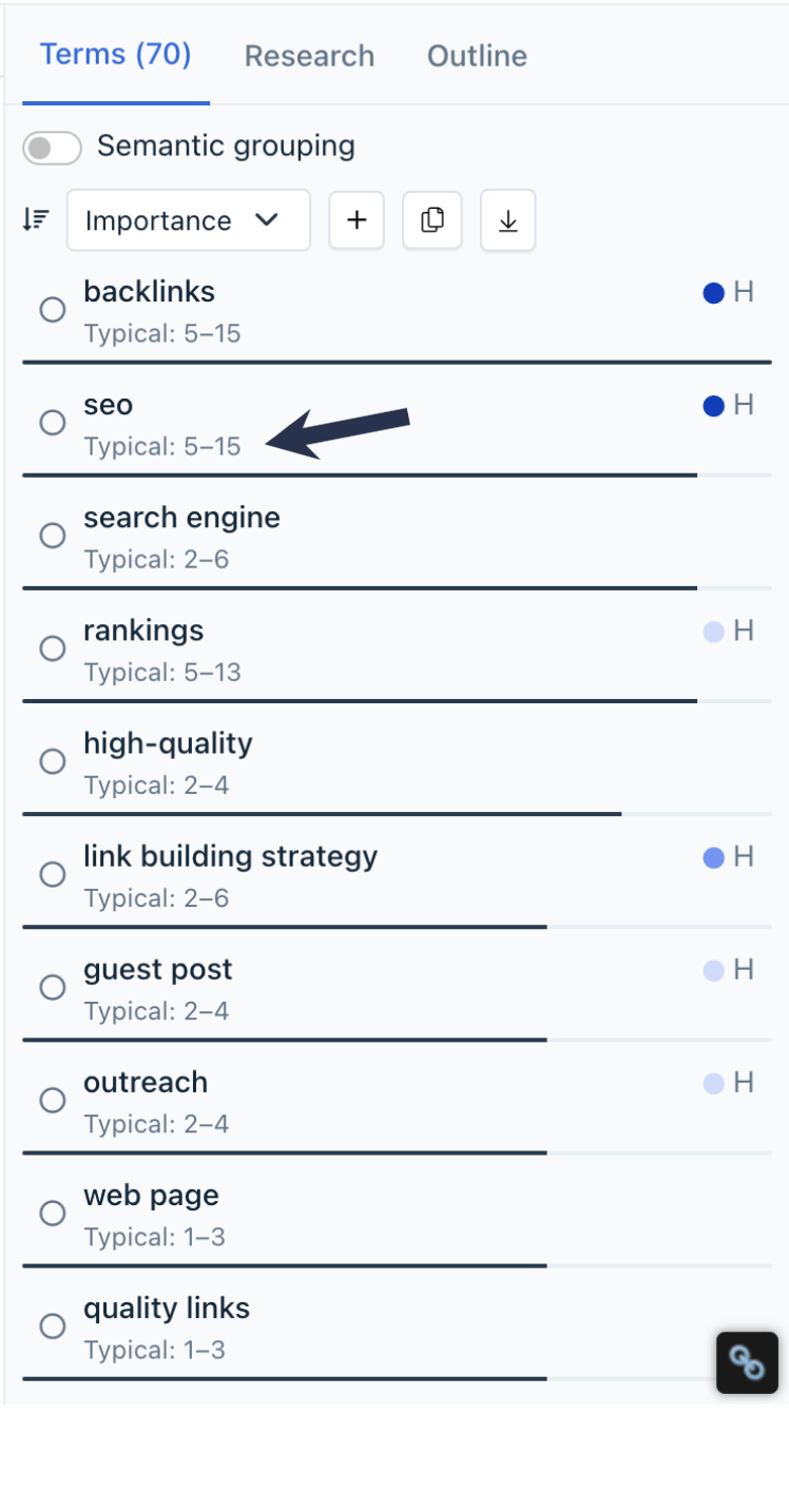 Clearscope will give you a whole column of keyword suggestions the top-ranking articles all share along with their average keyword density or times the phrase is mentioned. The terms on the right are parts of the Google knowledge graph of semantically related words for your target keyword.