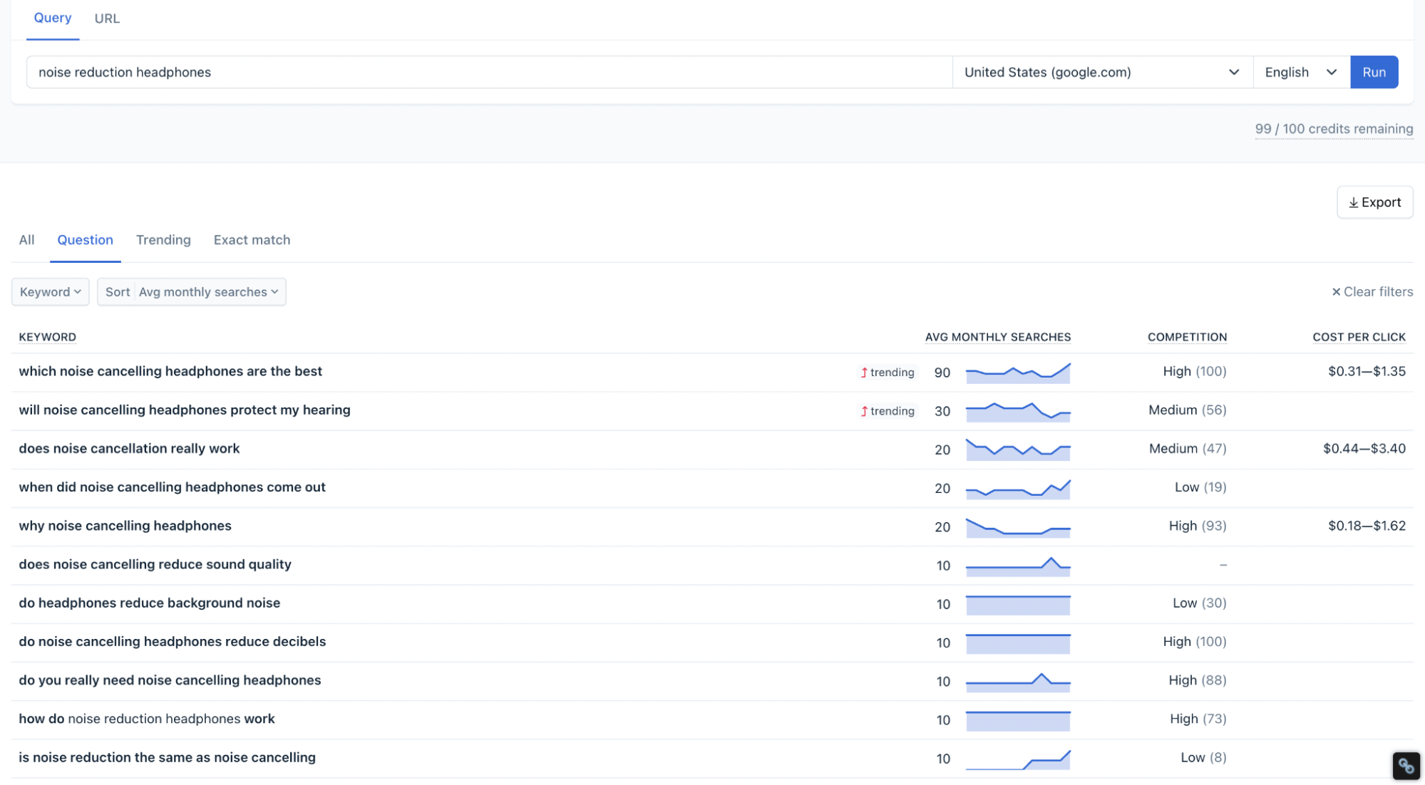 Here’s an example of questions surrounding the keyword “noise reduction headphones.” You’ll get different questions and relevant info like: