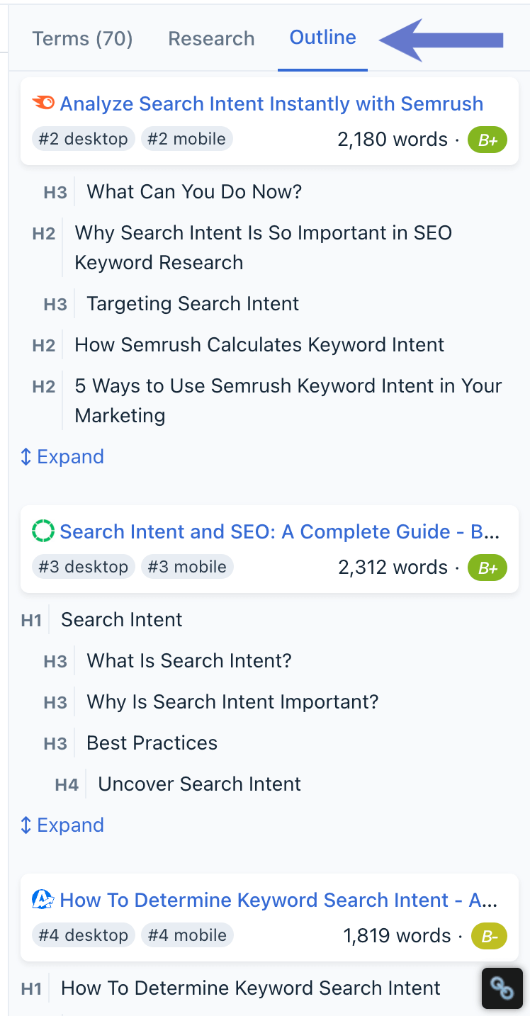 Clearscope’s tool also has a tab showing how all of your competitors outlined their content pieces. You can quickly see similar headings and topics your competing pages cover that you may want to cover in your piece.