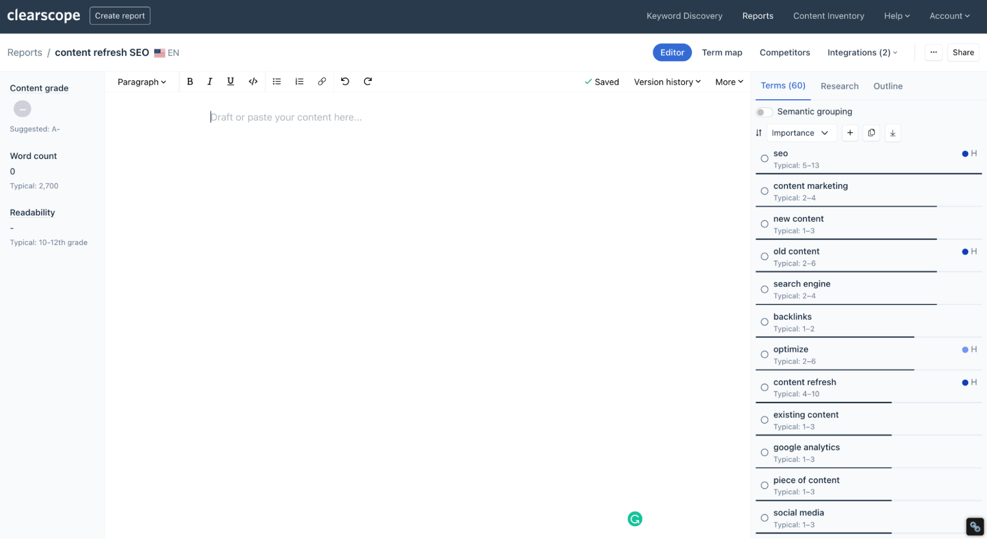 Write and refresh content with guided reports so you can produce content that ranks well from the get-go.