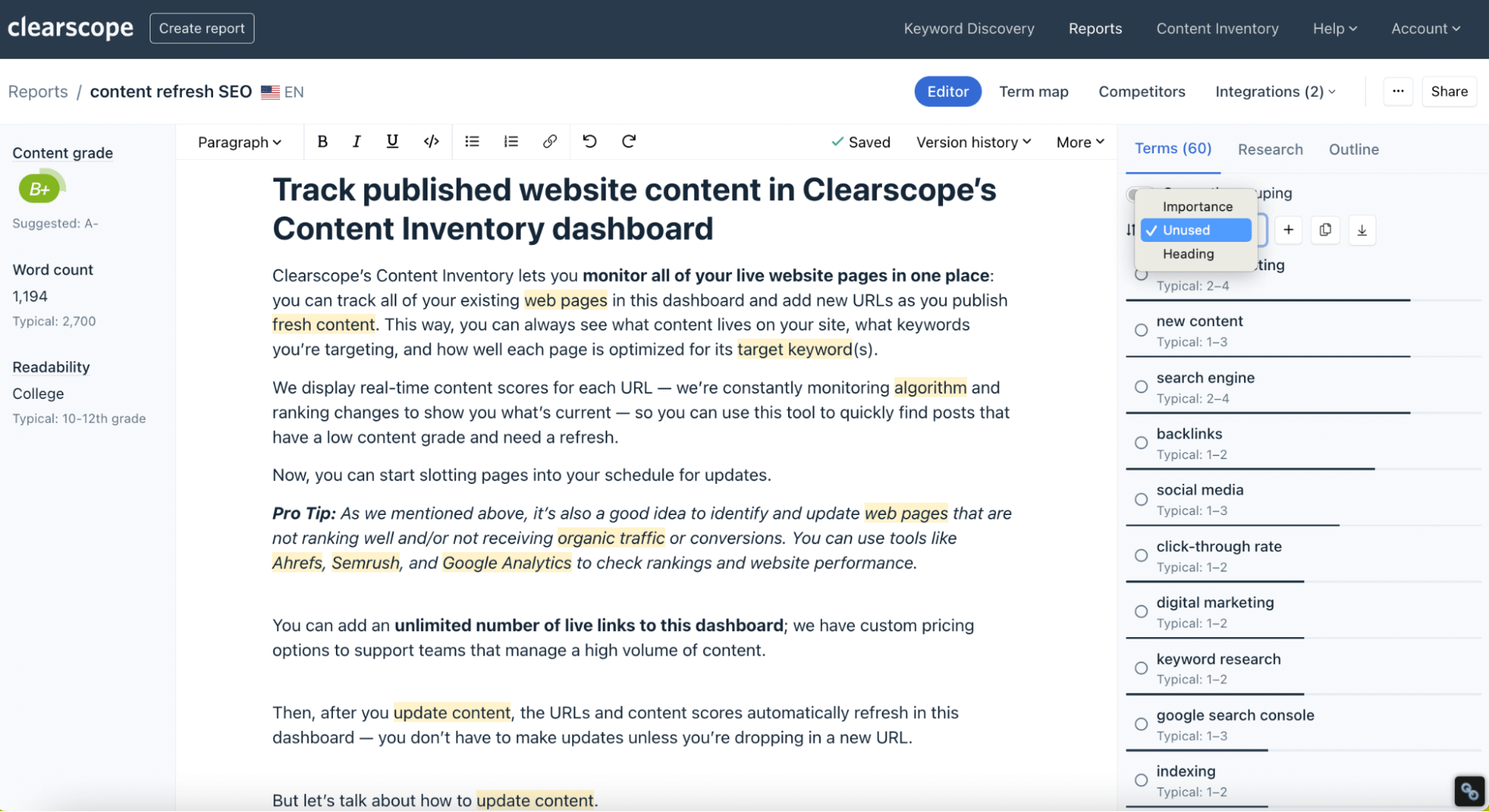 You can also turn on the Highlight feature to see which terms you’ve already used, and make edits to existing content without removing relevant information. We show you word count, content score, and readability level as you work, so you can make sure you’re making effective updates.