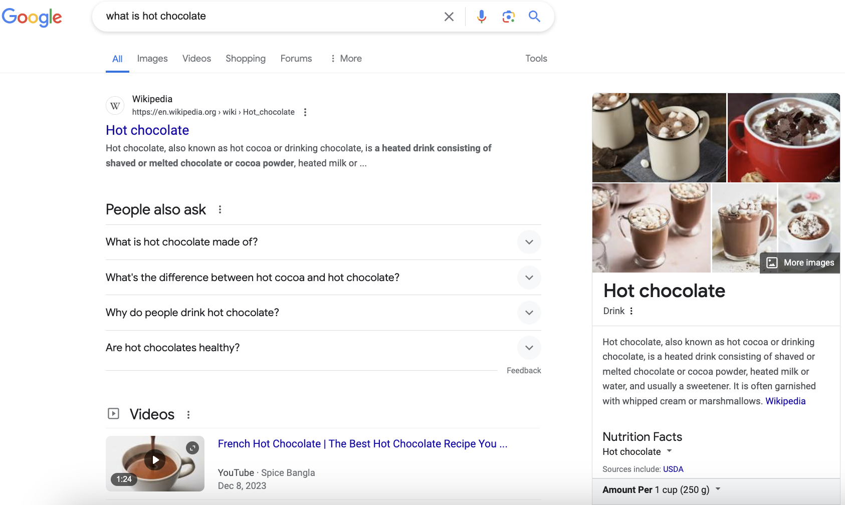 Google search results for [what is hot chocolate] shows a knowledge card and wikipedia page for the description of what hot chocolate is.