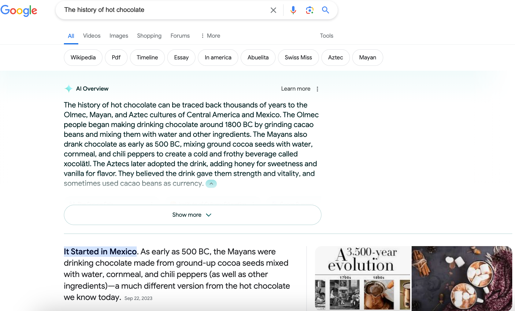 Google search results for [history of hot chocolate] shows an AI Overview, followed by a linked result and People Also Ask questions.