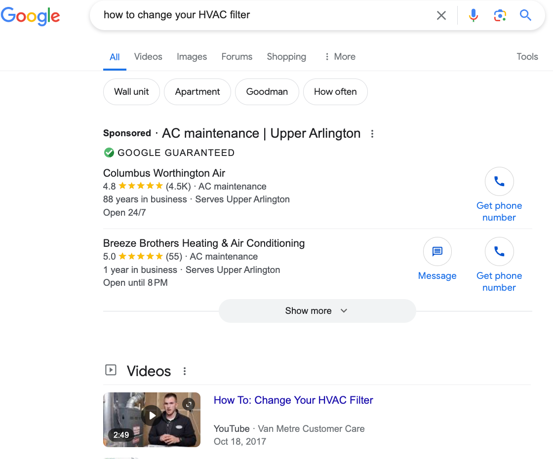 Search results for [how to change your HVAC filter] provides how-to video content along with recommended service providers in your area.