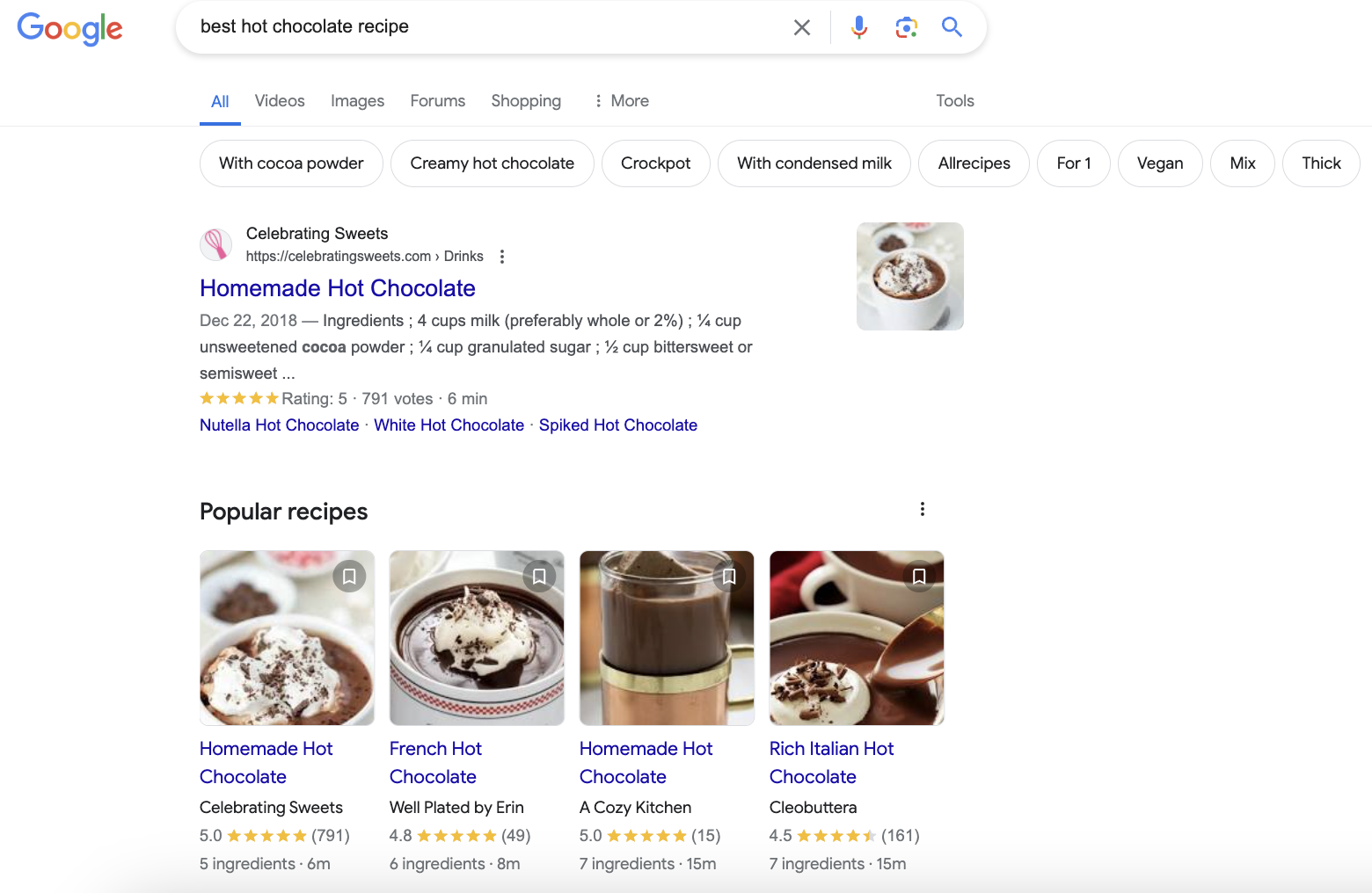 Let’s look at another example: If someone is typing in the query, [best hot chocolate recipes], they are searching for a combination of ingredients or recipes to make a great cup of hot chocolate.